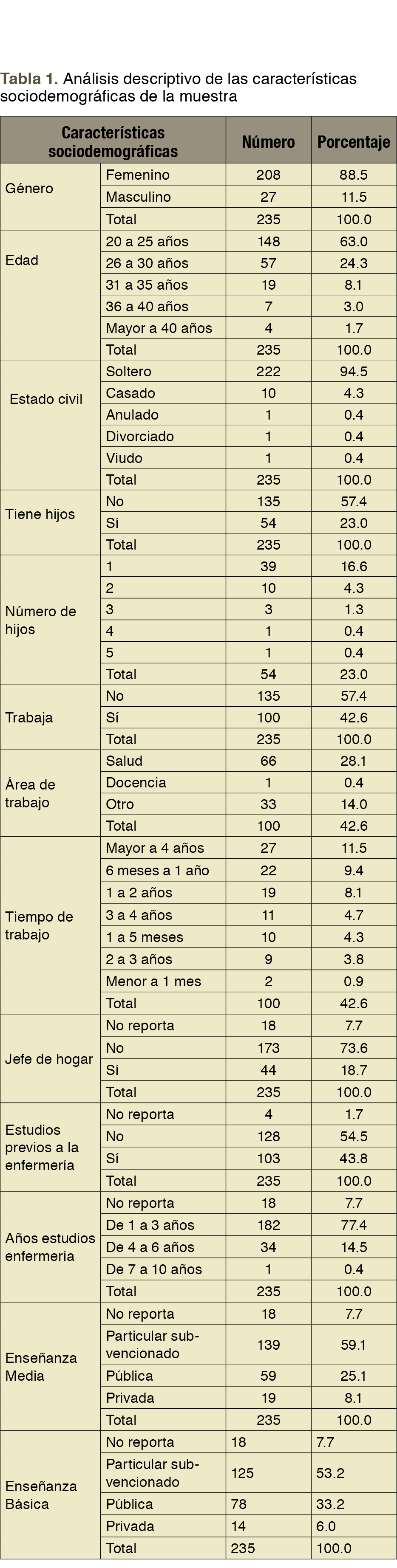 Los datos fueron recolectados por medio de un cuestionario estructurado y diseñado por los propios investigadores con base en la evidencia científica que se validó por un equipo de tres académicos: dos pertenecientes al área de la educación y uno del área de la salud, quienes evaluaron el contenido y la redacción. El cuestionario fue conformado por las siguientes variables: variables sociodemográficas: sexo (masculino, femenino); edad (20 a 25 años, 26 a 30 años, 31 a 35 años, 36 a 40 años, mayor de 40 años); estado civil (soltero [a], casado [a], divorciado [a], viudo [a], anulado); hijos (sí, no); número de hijos; trabaja actualmente (sí, no); área de trabajo (salud, docencia, otro); tiempo en el trabajo actual (meses, años); jefe de hogar (sí, no); estudios previos a enfermería (sí, no); tiempo en años en la carrera de enfermería (de 1 a 3 años, de 4 a 6 años, de 7 a 10 años, más de ١٠ años); enseñanza básica (pública, privada, particular subvencionada); enseñanza media (pública, privada, particular subvencionada).