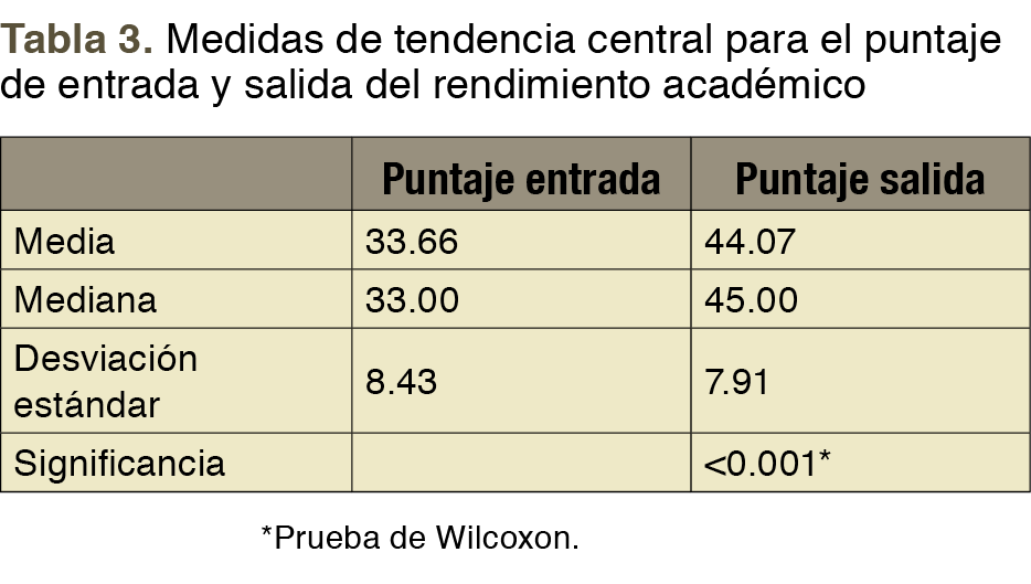 Respecto a la puntuación obtenida antes y después en los test integrativos, en la tabla 3 se observa que existen diferencias estadísticamente significativas (p < 0.001; prueba de Wilcoxon), con un nivel de significancia del 5% con un aumento del rendimiento académico posterior a las actividades de simulación.