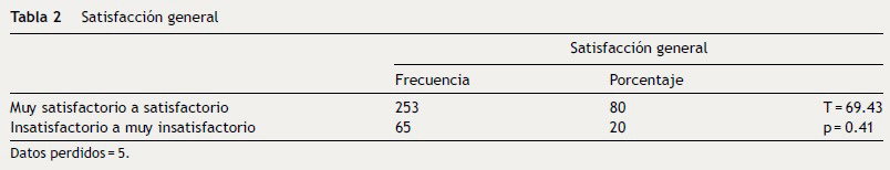 La satisfacción general de los alumnos encuestados indicó que su estancia en el ciclo escolar fue de «satisfactoria a muy satisfactoria» (80%; T = 69.43; p = 0.41) (Tabla 2).