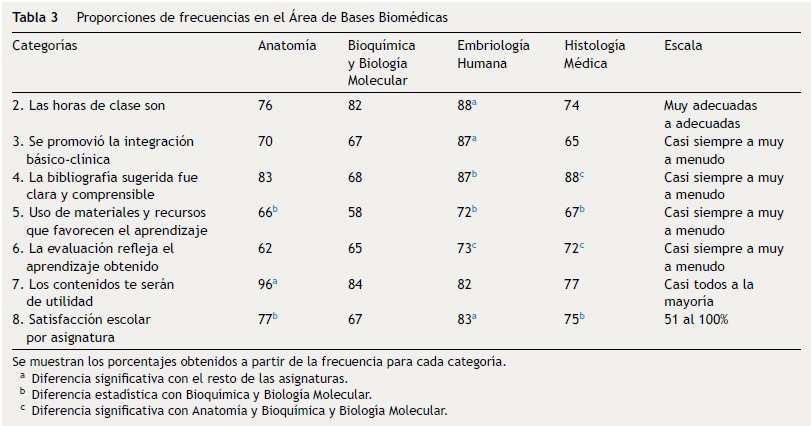 Tabla 3. Proporciones de frecuencias en el Área de Bases Biomédicas