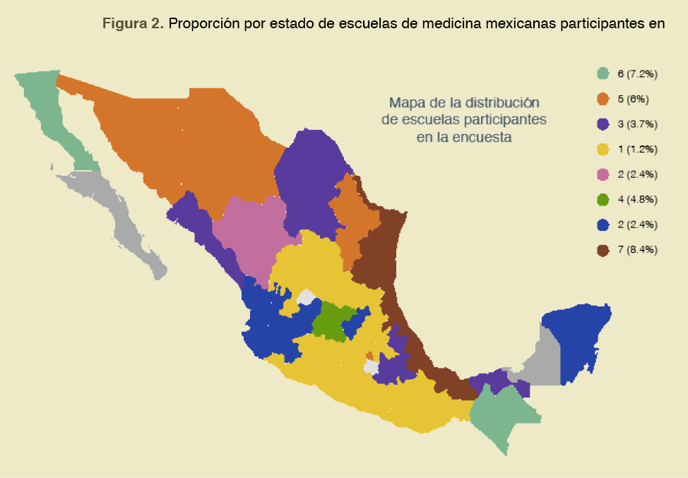 Se realizó un muestreo por conveniencia y se incluyó únicamente a las escuelas y facultades de medicina de la República Mexicana con acreditación vigente en el momento en que se inició el estudio (2021), por parte del Consejo Mexicano para la Acreditación de la Educación Médica (COMAEM). Se excluyó a las escuelas que no contestaron la encuesta en más del 60%, o aquellas de las cuales no se logró obtener información suficiente para completar más del 60% de la misma. La encuesta formó parte de un estudio que incluyó también escuelas y facultades de enfermería, acreditadas por el Consejo Mexicano para la Acreditación de Enfermería (COMACE), los resultados de enfermería se analizarán y publicarán de manera independiente.