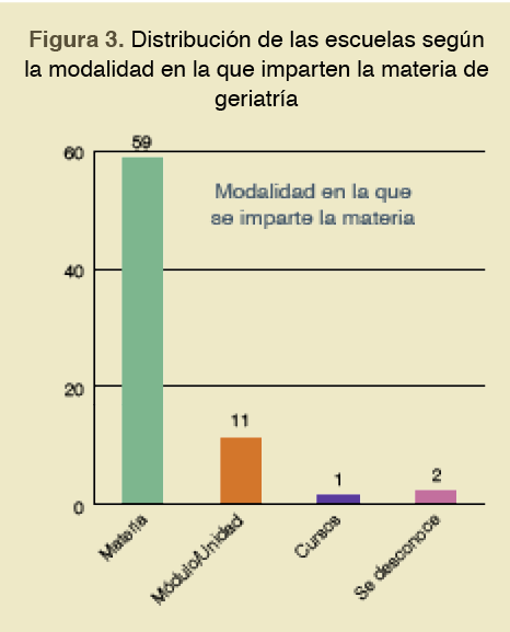 Se encontró que existe contenido de enseñanza sobre geriatría en un 88% (n = 73) de las escuelas, y en el 12% restante no existe algún programa relacionado con la asignatura. En las escuelas en donde no existe ningún tipo de plan educativo de geriatría, no se identificó una causa por la cual no ha sido incluido en el currículum.