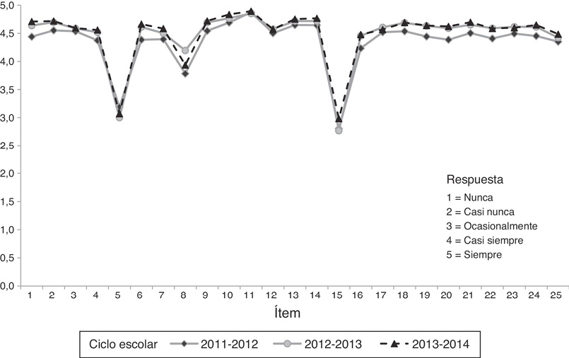 Resulta interesante que el comportamiento, en los siete ciclos escolares –cuatro de primero y 3 de segundo– fue uniforme ya que los valores de la confiabilidad interna fueron de 0.9, lo que sugiere que el instrumento puede utilizarse en encuestas posteriores17. Es interesante notar que tanto en primero como en segundo, en dos ciclos (2011-2012 vs. 2012-2013), en la mayoría de los ítems no hubo diferencias estadísticamente significativas. En los ciclos en los que sí existió diferencia, factores como la rotación de profesores, la influencia de los talleres y otros, podrían dar este cambio en las medias que no altera el patrón de respuesta como se aprecia en las Figura 1, Figura 2. Estos resultados quedan abiertos para su explicación futura.