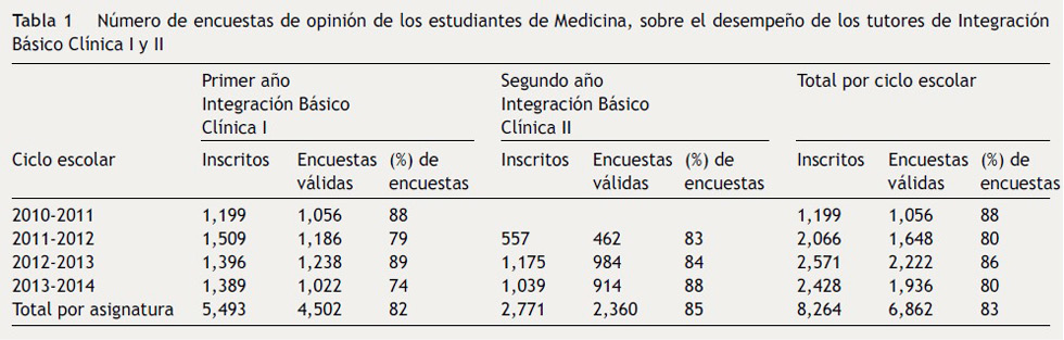 Tabla 1. Número de encuestas de opinión de los estudiantes de Medicina, sobre el desempeño de los tutores de Integración Básico Clínica I y II