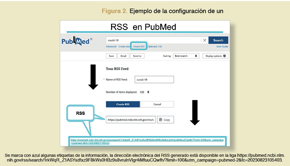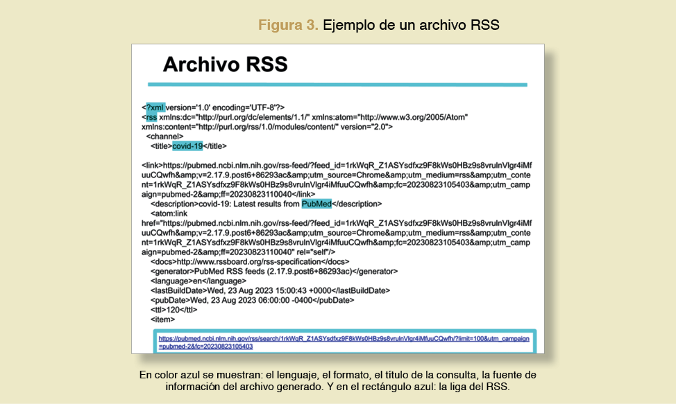 En la dirección electrónica (URL) del RSS hay un texto con formato XML (figura 3) en el que se establecen todas las indicaciones que leerá el canal de RSS para importar y estructurar la información. En algunos casos la sindicación simple ya se encuentra configurada con características fijas, en otros es posible configurar los detalles. Por ejemplo, la aplicación de PubMed permite generarlos de cualquier consulta, esto es, puede incluir, revistas, autores, instituciones, temas, términos, etc. Incluso el usuario puede elegir la cantidad de registros que uno recibe o la frecuencia con la que se actualizan. El procedimiento se puede ver en la figura 2 con la configuración de una sindicación simple, a partir de una consulta en la plataforma de PubMed. Se marca con azul algunas etiquetas de la información. La estructura de ese archivo XML se puede ver en la figura 3.