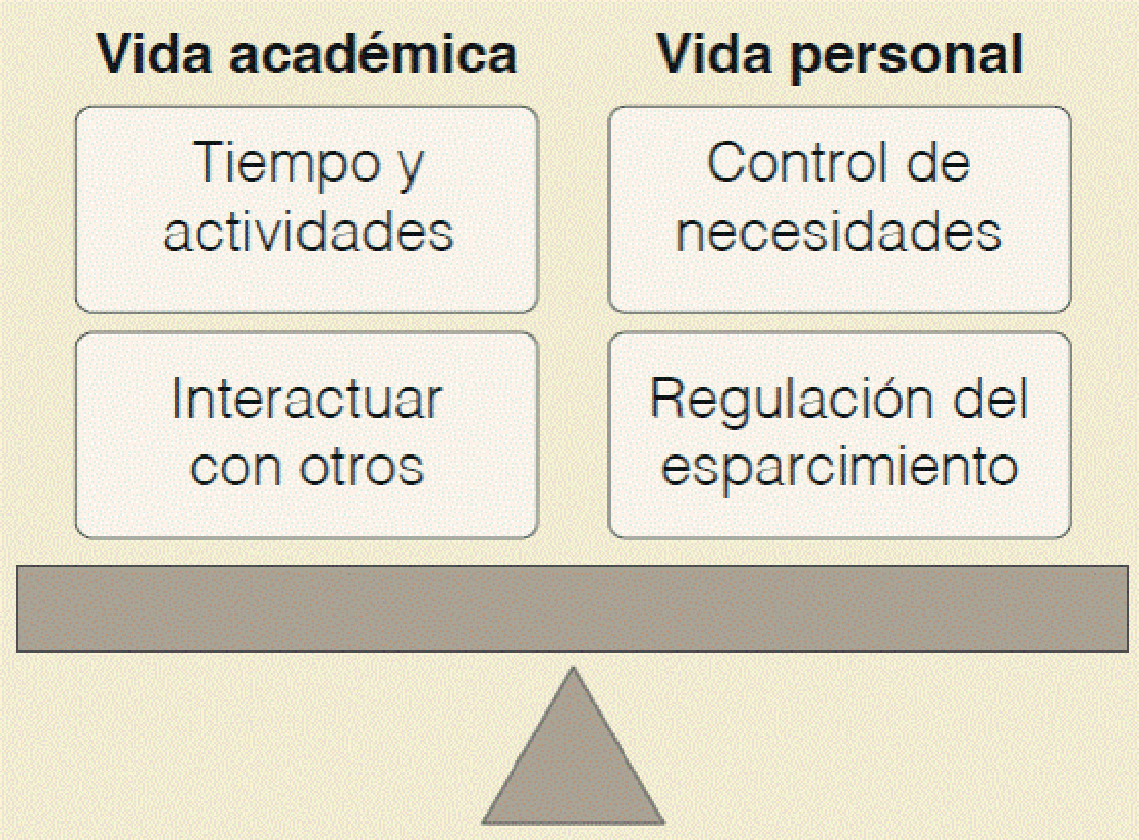 Los conceptos construidos en la codificación abierta se organizaron en dos ámbitos: vida académica y vida personal (figura 1). En primera, el discurso se centró en torno a la gestión del tiempo y actividades, e interacciones con otros. En la vida personal, los temas fueron el control de necesidades y la regulación del esparcimiento.