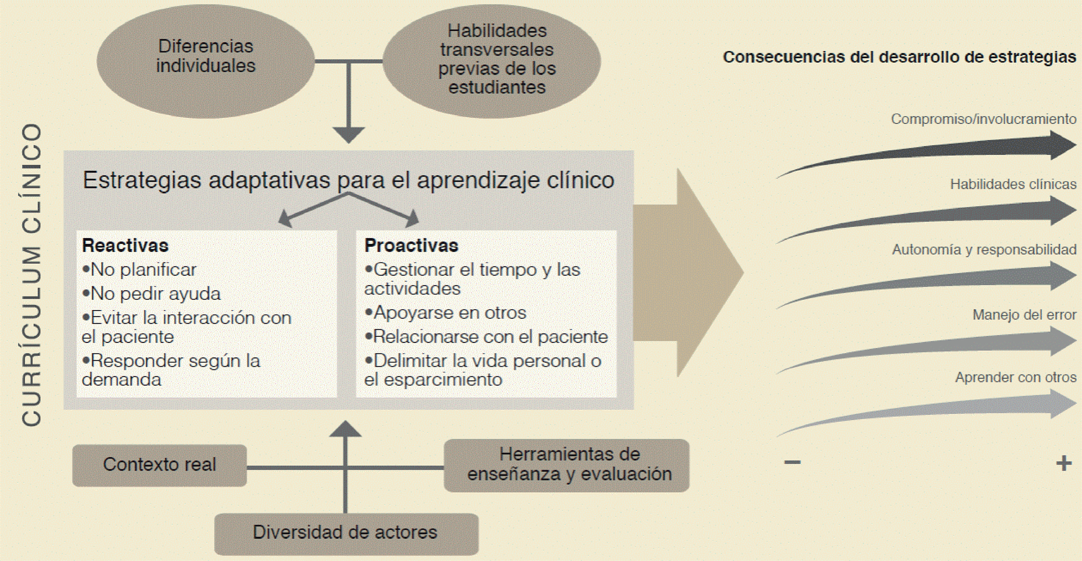 Resultados: Las estrategias reportadas fueron contextuales y abarcan el ámbito académico y personal, presentándose actitudes diferenciales: algunos con una orientación más activa y otros más reactiva. Las estrategias se vinculan a la gestión del tiempo y actividades, a las relaciones con otros en el contexto académico, al control de necesidades en el ámbito personal. Se propone un modelo interpretativo para explicar el fenómeno de adap tación a la clínica y sus implicanciones en la formación. Estas consecuencias abarcan cinco ámbitos de acción: involucramiento en el aprendizaje, desarrollo habilidades clínicas, autonomía y responsabilidad, manejo del error y relaciones con otros.