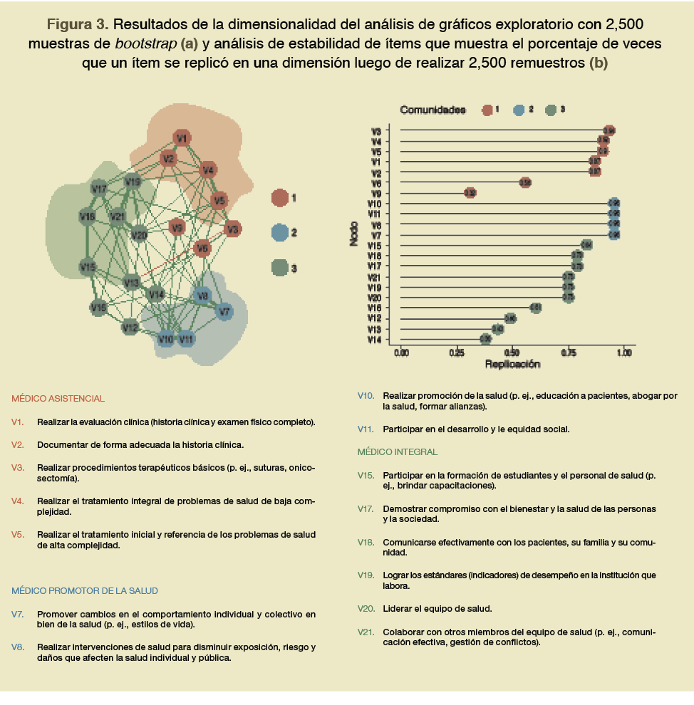 Las dimensiones identificadas fueron consistentes en los métodos de retención, y presentaron buenos índices de ajuste. La dimensión de “médico clínico” se asemeja a roles de otros modelos de competencias como el de ACGME con “cuidado de paciente”30 y CanMEDS con “médico experto”31. La dimensión de “médico promotor de la salud” es importante en este contexto, dado que el SERUMS está destinado a “desarrollar actividades preventivo-promocionales en establecimientos de salud”32. Por otro lado, la dimensión “médico integral”, refleja las competencias no clínicas del médico que, para el MINSA, ACGME, CanMEDS, son más de solo una15,30,31. Esta conceptualización podría reflejar la persistencia del paradigma médico tradicional, donde ser médico solo representaba actividades clínicas33.