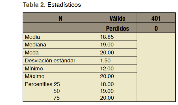 Results: The results in the PCA showed an appropriate sample adequacy and pertinent elements in the analyzed tool. The inner consistency for the tool showed a standardized value of 0.87, which provides evidence to assure that the items measure the same construct related with the pattern of answers among themselves.