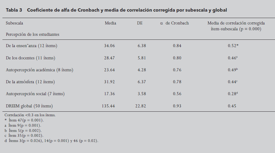 Se calculó el coeficiente alfa de Cronbach para cada subescala, el alfa global, la desviación estándar y la correlación corregida ítem-subescala (tabla 3).