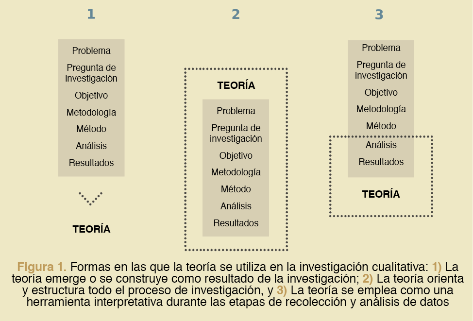 Una teoría específica (generalmente una macroteoría) puede guiar todo el proceso de un estudio. Lo más importante es que los conceptos identificados como centrales en la teoría se utilicen en el análisis6. Ubicar un estudio dentro de una teoría existente permite al investigador aprovechar los conceptos existentes, justificar el enfoque y las técnicas utilizadas para realizar el estudio, y organizar, analizar e interpretar los datos recopilados. La teoría, empleada de esta forma, ofrece un marco organizativo que permite integrar categorías predefinidas (apriorísticas), interpretar los datos a partir de estas y describir o explicar el fenómeno en estudio en función de ellas8.