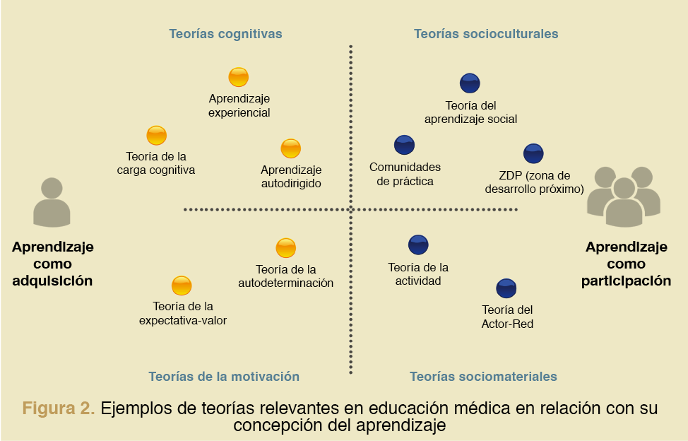 En este punto, resulta fundamental precisar el nivel en el que un investigador pretende explorar un fenómeno educativo, lo que se conoce como la unidad de análisis19. Tal como se mencionó anteriormente, en el nivel de las grandes teorías, la unidad de análisis puede abarcar fenómenos amplios, como la educación médica en su totalidad. En el nivel de las macroteorías, la atención se centra en las estructuras y sistemas dentro de las organizaciones (p. ej., equipos clínicos dentro de hospitales escuelas), considerando aspectos sociales, culturales y contextuales propios del entorno de aprendizaje6. Estas teorías conceptualizan el aprendizaje como un proceso de participación. Por otro lado, en el nivel de las microteorías, la unidad de análisis es el individuo, abarcando aspectos como sus motivaciones, desempeño y desarrollo19,20. En este nivel, el aprendizaje se entiende como un proceso de adquisición21 (figura 2).