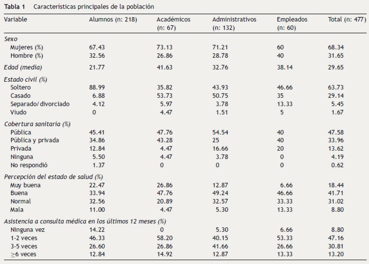 Criterios de inclusión: para los alumnos, pertenecer a la matrícula de estudiantes inscritos en cualquier grado académico, sin importar el curso (la mayoría en materias de verano), durante el periodo del 4 al 22 de julio de 2016; personal docente, hallarse contratado por la institución como profesor, sin importar el tipo de convenio ni el nivel o cátedra impartidos; administrativos, ocupar un puesto oficial dentro de la administración institucional, como encargado, secretario, auxiliar u otro de la misma índole, sin importar el departamento de trabajo; empleados en general, laborar dentro de la universidad en un puesto excluido de los previamente mencionados, a pesar de contar o no con un contrato directo, como quienes se ocupan de la intendencia, mantenimiento o seguridad universitarias. Se incluyeron en todos los apartados a sujetos de los dos campus existentes en la ciudad, pero en su mayoría, especialmente los estudiantes, del central. Quienes podrían clasificarse en más de un estrato, fueron incluidos en el considerado principal por el participante.
