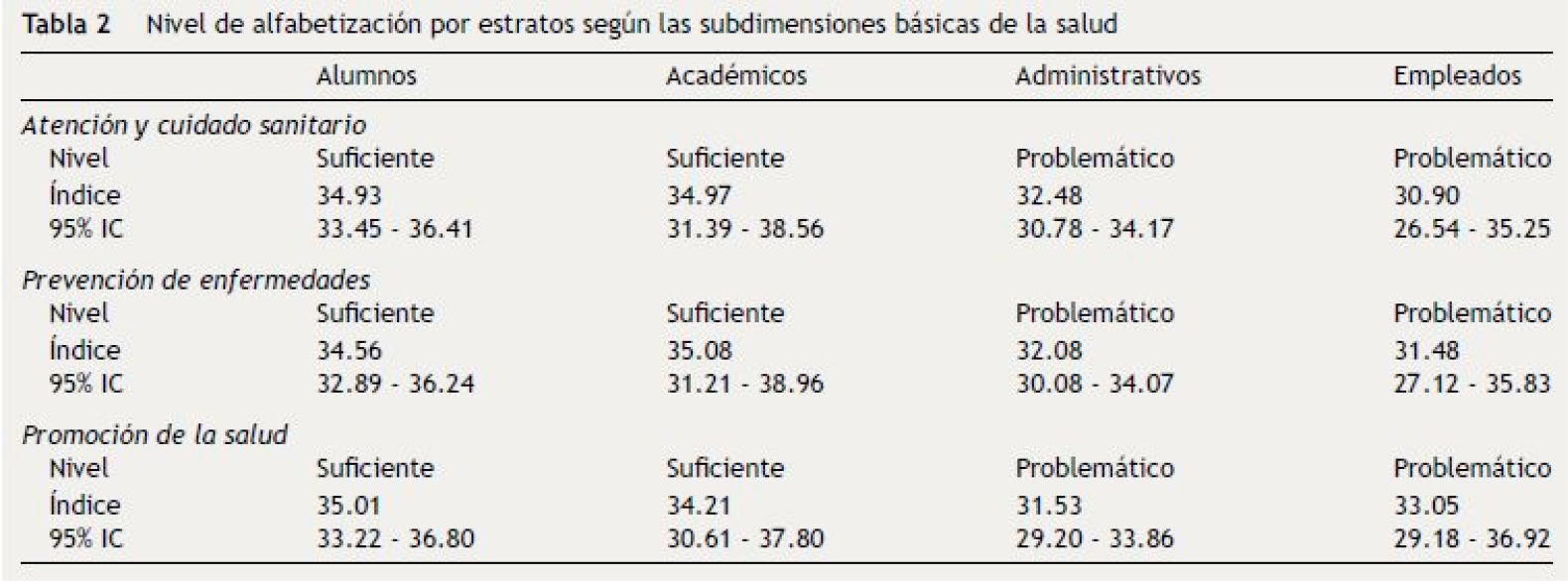 En la tabla 2 se señala el resultado por grupo de población, de acuerdo a los subtemas: atención y cuidado sanitario, prevención de enfermedades y promoción de la salud, donde, sin diferencia estadísticamente significativa, se encontró una media de grado problemático en cada uno los rubros mencionados entre administrativos/empleados y suficiente entre alumnos/académicos.