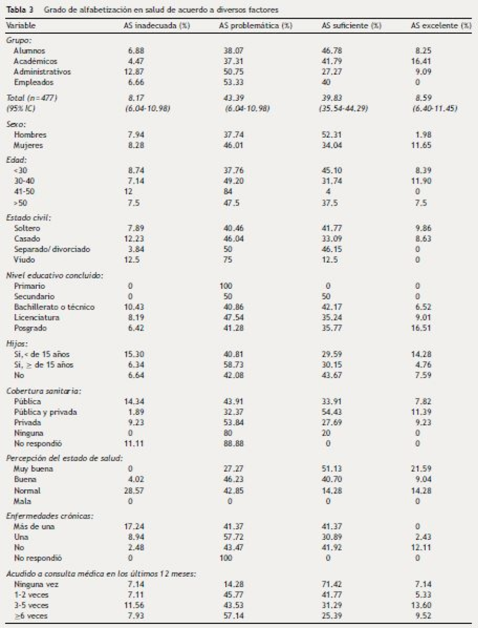 Tabla 3. Grado de alfabetización en salud de acuerdo a diversos factores