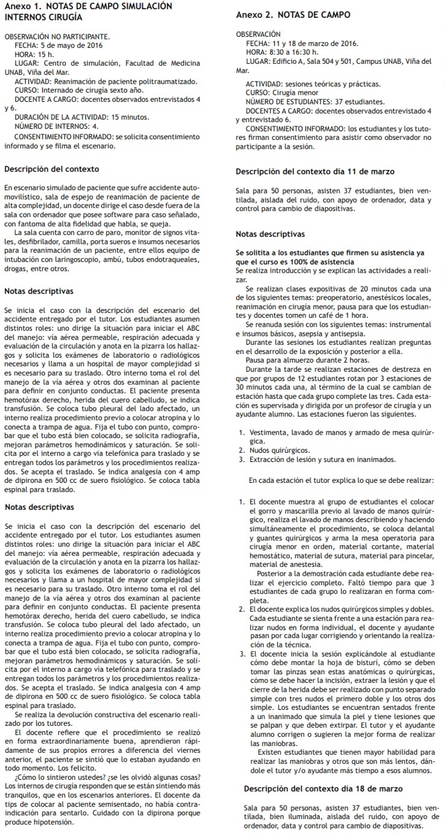 Lo anterior, se observó claramente en la fase de campo, cuando los docentes realizan una introducción de las actividades a realizar, acompañado de una clase expositiva de 20 min aproximadamente que incluye contenidos quirúrgicos. Después de esta instancia se rectifica lo mencionado por los docentes, el aprendizaje práctico de la cirugía cumple un porcentaje mayor de la instrucción. Posibilitando a los estudiantes a practicar en estaciones de destrezas [sujetos observados, entrevistado 4, hombre, médico, 37 años; entrevistado 6, hombre, médico, 48 años] (Anexo 1,2 y 3).