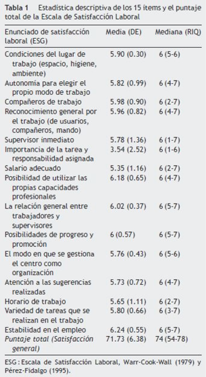 La media del puntaje total de satisfacción general fue 71.73 (DE= 6.38). El nivel de satisfacción con la «estabilidad en el empleo» fue el más alto, seguido de la posibilidad de utilizar las propias capacidades profesionales, la relación general entre trabajadores y supervisores y las posibilidades de progreso y promoción. Los puntajes de satisfacción más bajos se reportaron en la importancia de la tarea y responsabilidad asignada y el salario recibido (tabla 1).