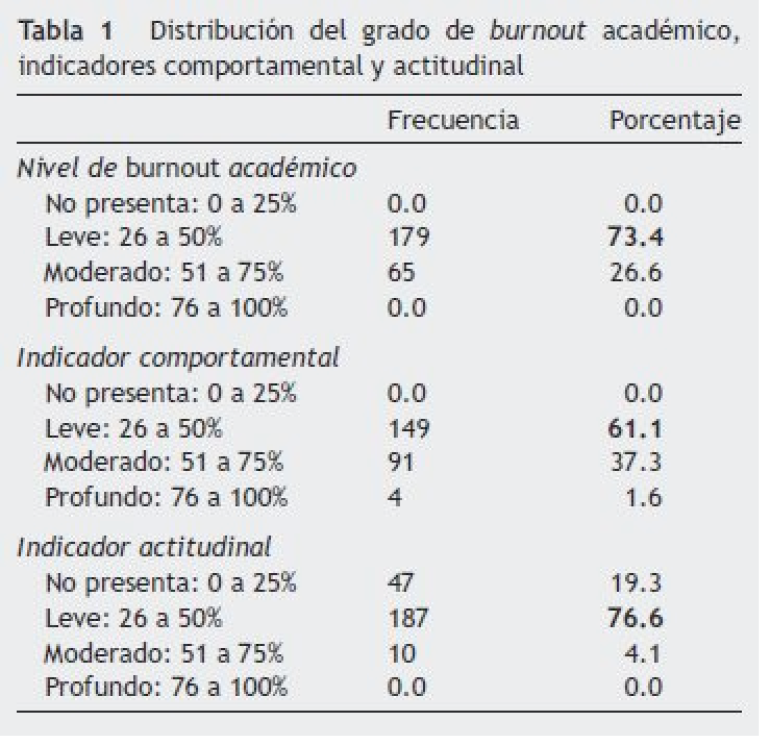 De los 244 participantes, el 100% presentaron algún grado de burnout (73.4% en rango leve y 26.6% en moderado). El nivel leve de burnout académico es el que se expresó con mayor preponderancia; comportamental (61.1%) y actitudinal (76.6%) (tabla 1).