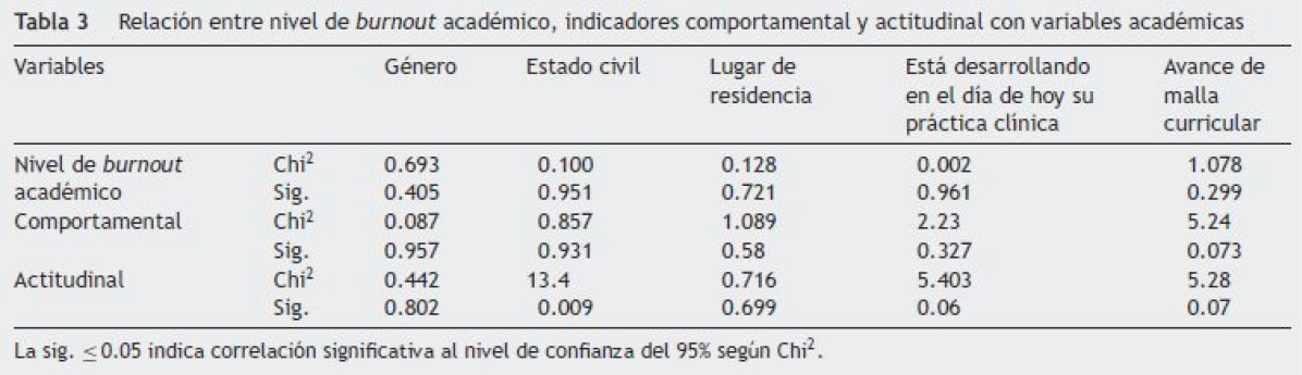 Tabla 3. Relación entre nivel de burnout académico, indicadores comportamental y actitudinal con variables académicas