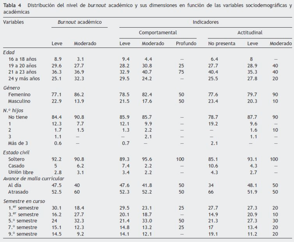 Referente a la distribución de burnout académico y sus indicadores en función de las variables sociodemográficas, se apreció que en el rango de edad de 21 a 23 años, ser mujer, no tener hijos y estar soltero aparece más crítico al momento de presentar el síndrome, encontrándose esencialmente entre «leve» y «moderado».