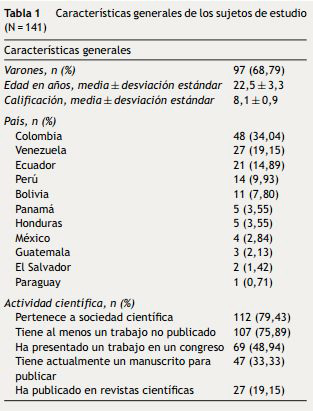 Resultados: Se incluyeron 141 estudiantes; el 79,43% pertenecía a una sociedad científica, el 48,94% había presentado al menos un trabajo en un congreso, mientras que el 19,15% tenía al menos una publicación científica; los estudios transversales y las cartas al editor son el principal tipo de publicación, con una prevalencia del 37 y el 33%, respectivamente.