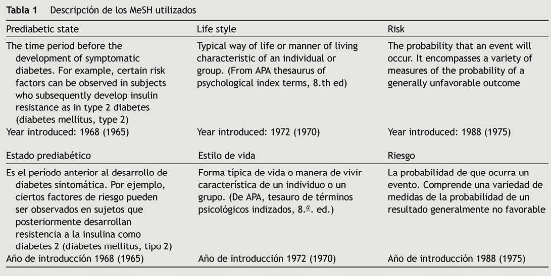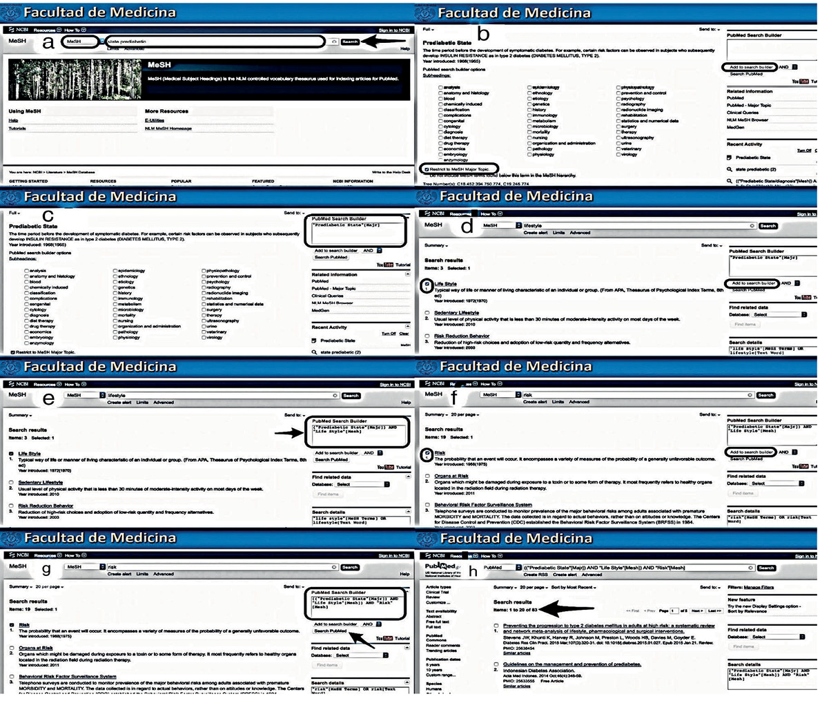 Se buscan los MeSH (todos están en inglés) que correspondan y que estén disponibles en la base de datos de acuerdo con los componentes de la pregunta PICO. Por ejemplo: «state prediabetic» (estado prediabético), «lifestyle» (estilo de vida) y «risk» (riesgo). Estos tres MeSH son los más importantes, los mismos que también se encuentran disponibles.