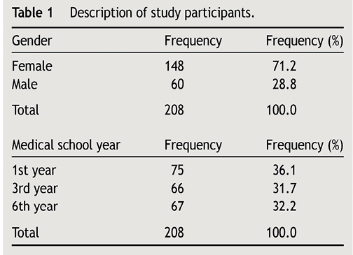 The final sample was composed of 208 students who represent 66.6% of the population (Table 1). There were 148 females (71.2%) and 60 males (28.8%) and the age mean of the students was 21.38 years and standard deviation 2.77. Considering the years of enrollment, students are distributed as follows: 75 in the 1st year, 64 in the 3rd year and 67 in the 6th year.