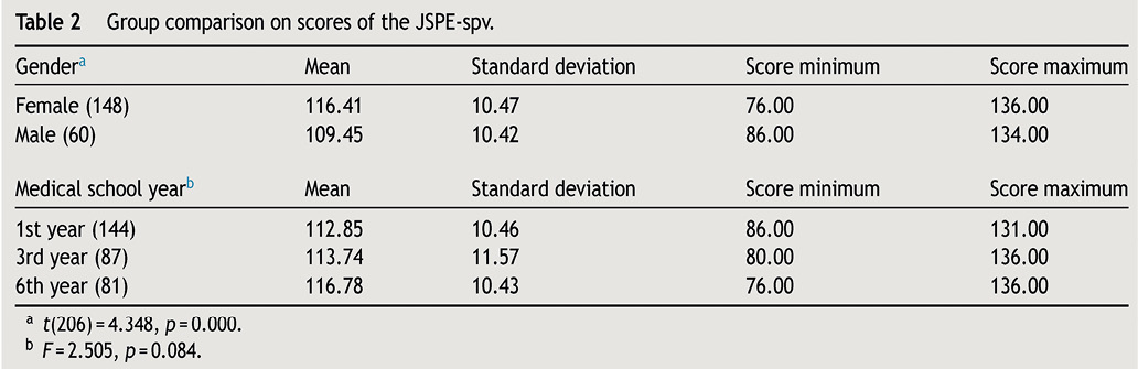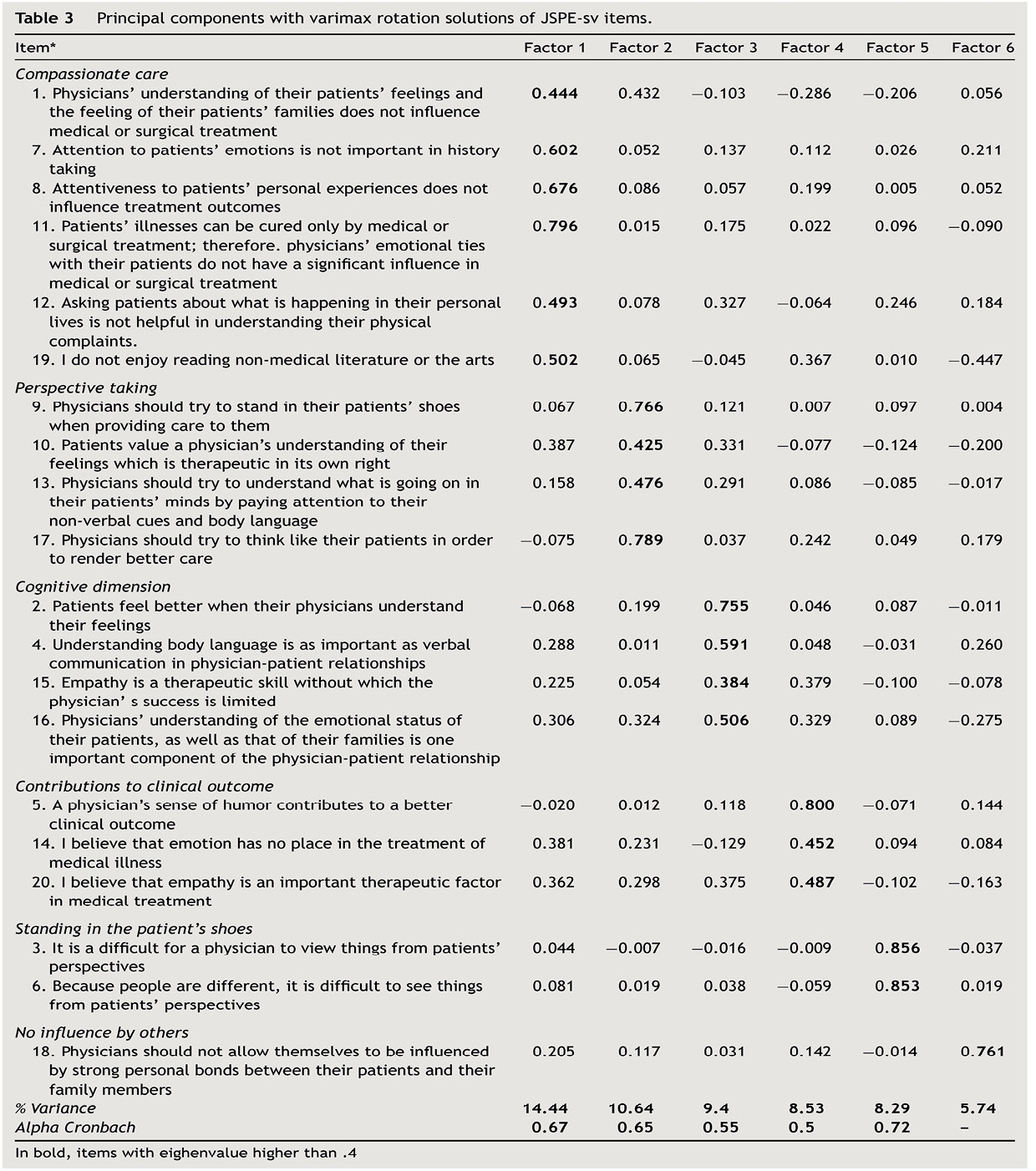 The data analysis was conducted computing first the sum of the item total score of the JSPE-spv for two subsamples of female and male, calculating the mean and applying a t-test and an ANOVA Test to calculate the significance of the means of the different years students. Second, a factor analysis was performed following the next steps: (a) Bartlett's test of the sphericity and the KMO - Kaiser-Meyer-Olkin measure of sampling adequacy were determined to measure the goodness of factor analysis. (b) The principal component analysis was run to extract the number of components. (c) The retained components were submitted to a varimax rotation and following the criteria of eigenvalue >1,25 six main factors were retained. In addition, factor coefficients greater than 0.4 were used to make the interpretation of suggested components. To analyze the internal consistency of these factors the test of alpha Cronbach was used.