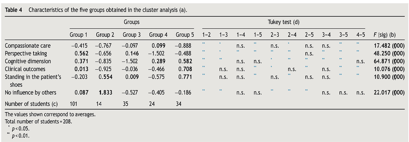 Group 1 of the cluster analysis groups the largest number of students (101), showing a positive relationship with the dimensions “perspective taking”, “cognitive dimension”, “clinical outcomes”, “the influence by the others” and negative with dimensions “compassionate care” and “patient standing in shoes”. Group 2 of the cluster, group of 14 students, shows highly positive relationship with the dimension “no influence by others” and also positive with “standing in patient shoes” and presents negative relation with the other dimensions. Group 3 of the cluster, group of 35 students, presents positive relationship with the dimension “perspective taking” and negative or null with the others. Group 4 of the cluster, group of 24 students, shows a positive relationship with “cognitive dimension” and “compassionate care” and negative relationship with the others. Group 5 of the cluster, group of 34 students, presents a positive relationship with the “cognitive dimension”, “clinical outcomes” and “standing in patient shoes” and negative relationship with the others.