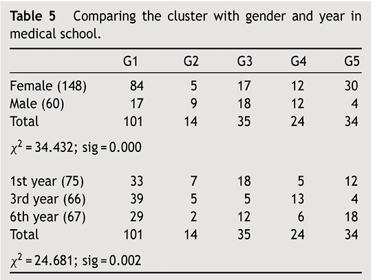 Also, we tried to find same relationships between the groups identified in cluster analysis and the characteristics of the sample of students, namely gender and year in medical school (see Table 5). It is possible to say that the distribution of students’ gender by the groups that were identified is statistically significant, as the chi-square test proves.