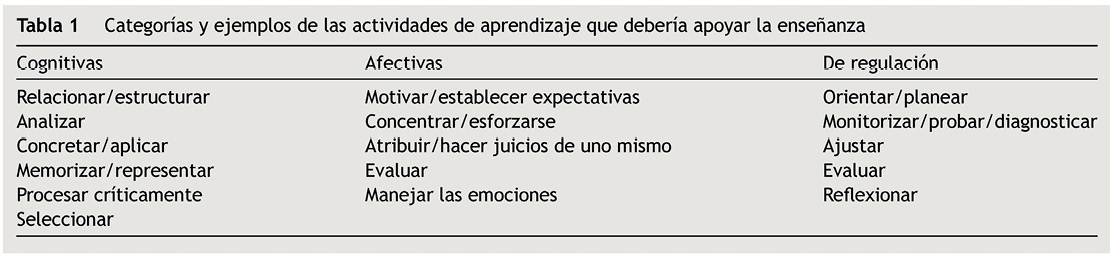 Tabla 1. Categorías y ejemplos de las actividades de aprendizaje que debería apoyar la enseñanza.