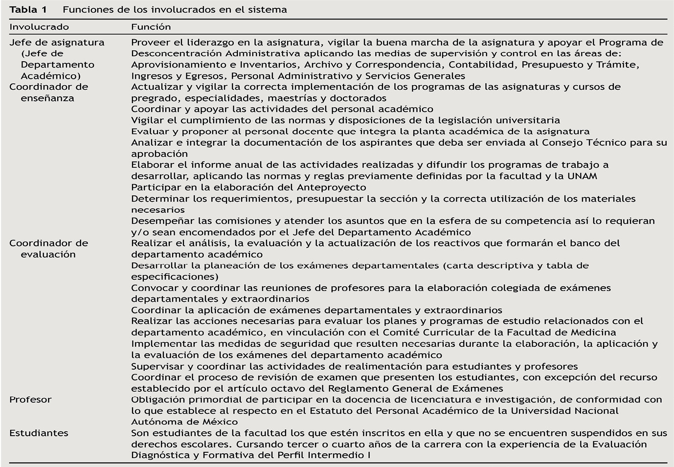 La muestra se eligió por conveniencia con el objetivo de reflejar la diversidad dentro de la población de involucrados de la Facultad de Medicina, y se dividió en 2 grupos: el de estudiantes y el de profesores, que incluye a los jefes de asignatura, los coordinadores de enseñanza, los coordinadores de evaluación y los profesores de asignatura. En la Tabla 117,18 se abordan las funciones de cada integrante del sistema.