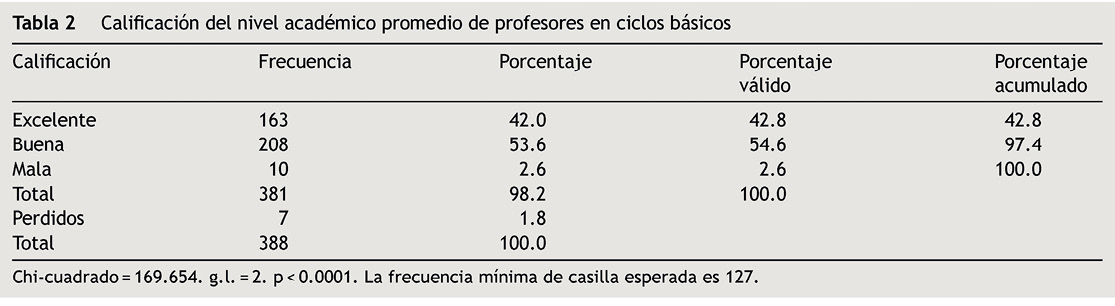 Tabla 2 Calificación del nivel académico promedio de profesores en ciclos básicos