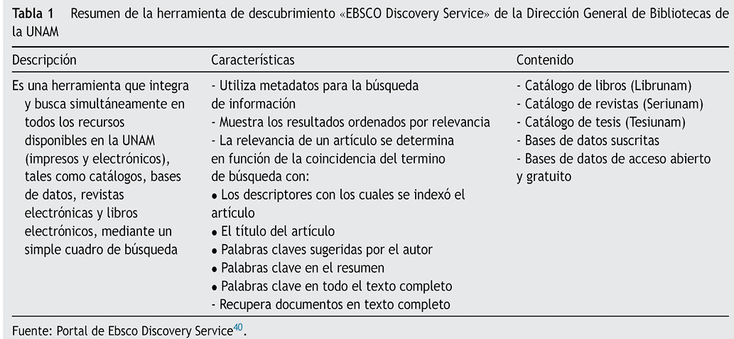 Tabla 1 Resumen de la herramienta de descubrimiento «EBSCO Discovery Service»