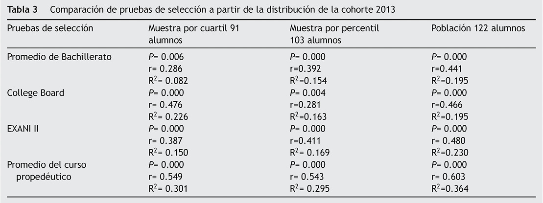 Tabla 3 Comparación de pruebas de selección a partir de la distribución de la cohorte 2013