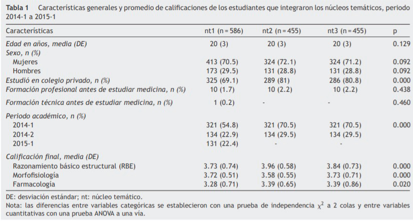 Resultados: Se identificaron 1.496 estudiantes con media (DE) de edad 20 (3) años, la mayoría mujeres (71%); el 40% cursaron el nt1, 30% nt2 y 30% nt3; se evidenciaron diferencias positivas en las medias de desempeño académico entre los periodos 2014-2 y 2014-1 en los 3 núcleos temáticos de farmacología y razonamiento básico estructural; no se identificaron cambios en morfofisiología. Se identificó relación entre los antecedentes de formación del docente y del estudiante con el desempeño académico y el tiempo de exposición al MGA.