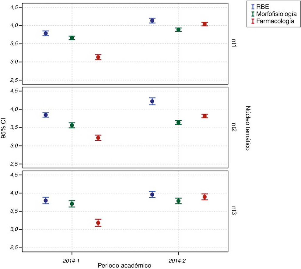 Results: A total of 1,496 students were identified with a mean (SD) age of 20 (3) years, with a majority (71%) of women. Attendance at NT1 was 40%, NT2 30% and 30% in NT3. Positive differences were observed in mean academic performance between the periods 2014-2 and 2014-1. In pharmacology at the nt1 it was 0.91 (95% CI: 0.93 to 0.99), in nt2, 0.6 (95% CI: 0.51 to 0.68) and 0.72 in nt3 (95 CI%: 059-.84); clinical reasoning in the nt1 was 0.35 (95% CI: 0.26 to 0.44), in nt2 0.37 (95% CI: 0.26 to 0.48), and 0.16 in nt3 (95% CI: 0.04 to 0.28). No changes were seen in morphology-physiology.