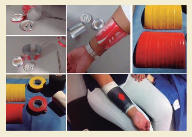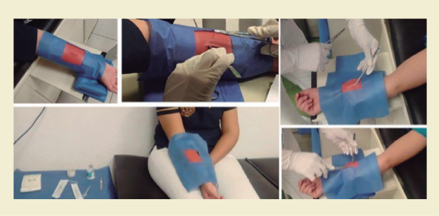 Finalmente, un segmento de 15 x 30 cm de tela para mesa de exploración con un orificio céntrico de 4 x 5 cm que semejaba un campo quirúrgico (figuras 1 y figura 2). Posteriormente, al prototipar el modelo se realizaron adaptaciones para hacerlo más ergonómico y reducir los tiempos de colocación, se diseñó para ello una manga con tela elástica color piel a la cual se le realizaron adaptaciones para poder introducir lateralmente el constructo que emula la piel y la protección de aluminio, así como una hendidura de 3 x 4 cm en la cara anterior (figura 3). Para el uso del bastidor, se utilizó un segmento de tela (popelina o bondeada) de aproximadamente 30 x 30 cm bastidor con aro de madera de 15 cm de diámetro, todos los alumnos trabajaron con sutura Nylon 3-0 aguja cortante invertida de medio círculo e instrumental de cirugía menor.