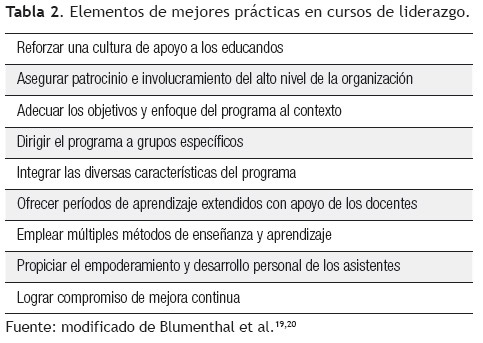 Por otra parte, Blumenthal identificó nueve elementos que constituyen las mejores prácticas de los cursos de liderazgo, enlistados en la Tabla 2.19,20 Se recomienda a los educadores y clínicos interesados en implementar actividades de este tipo tomar en cuenta estas recomendaciones.