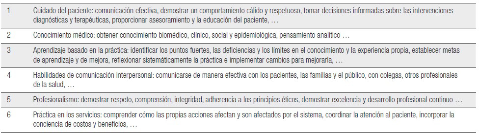 Las seis competencias que presenta el ACGME se pueden interpretar como los dominios en los que un médico debe demostrar su competencia. Por ello, la construcción de competencias es una integración compleja pero demostrable al concretar los numerosos objetivos relacionados que la componen en comportamientos medibles. La definición de las competencias ayuda a alcanzar una meta compleja e integradora, que por su naturaleza es abarcadora, de largo alcance, pero también con poca claridad.