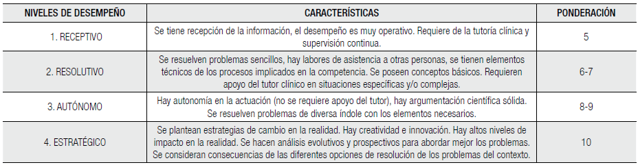 Resultados: Los MIP alcanzaron un nivel autónomo (8-9) en las competencias: comunicación, sociocultural; así como en diagnóstico y manejo de patologías respecto a examinar al paciente en forma completa y sistemática respetando la dignidad e integridad del paciente. No obstante, se ubicaron en un nivel receptivo (5-6) y un nivel resolutivo (6-7) en la competencias cultura en salud y solución de problemas, su desempeño es operativo, requiere de la supervisión continua del tutor clínico. Se observó relación significativa entre la preparación del tutor y la actitud amable y cordial del MIP, al explorar al paciente (0.28).