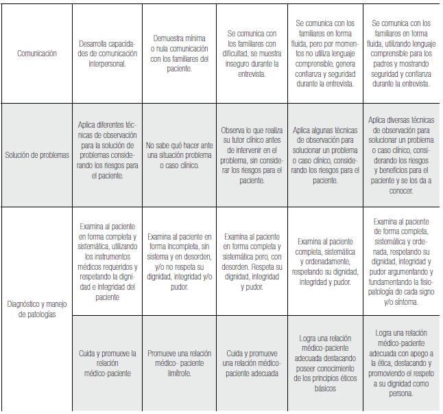 En este estudio, los desempeños que integran el perfil humanista corresponden a los aprendizajes esperados de las competencias: sociocultural, cultura en salud, comunicación, solución de problemas, así como diagnóstico y manejo de patologías referida también como competencia clínica.