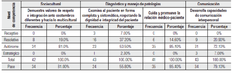 Results: The UMI achieved an autonomous performance level (8-9) in the competences of: communication, socio cultural interrelationships and diagnosis and management of diseases. However the UMI showed a receptive level (5-6) and resolving (6-7 in the competence of culture in health and troubleshooting, they require support from the clinical tutor. Significant relationship was observed between the preparation of the tutor and the display a friendly, respectful, cordial attitude of the MIP to explore their patient (0.28).