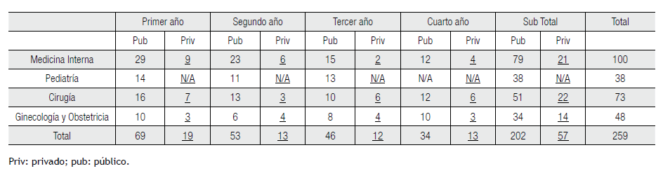 Tabla 1. Población total de residentes del PUEM en las especialidades troncales del hospital privado y público en el ciclo académico 2012-2013