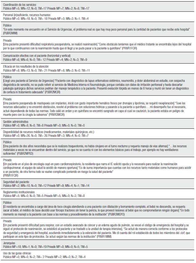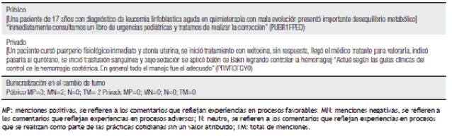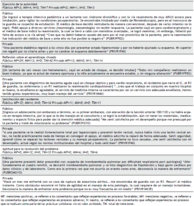 Resultados: Para los residentes del hospital público las jerarquías imperantes en el contexto clínico tuvieron efecto positivo en la eficacia de la atención médica, aunque también hubo abuso de poder, las menciones negativas aludieron a la falta de recursos. En el privado, la seguridad del paciente sobresalió en los relatos.