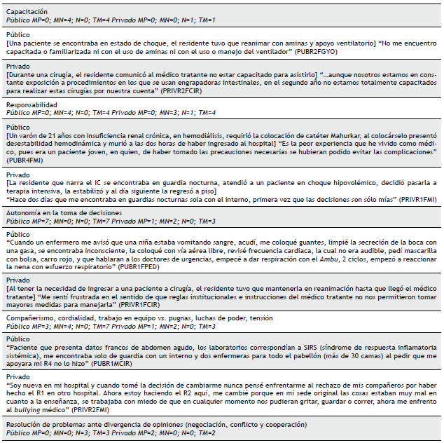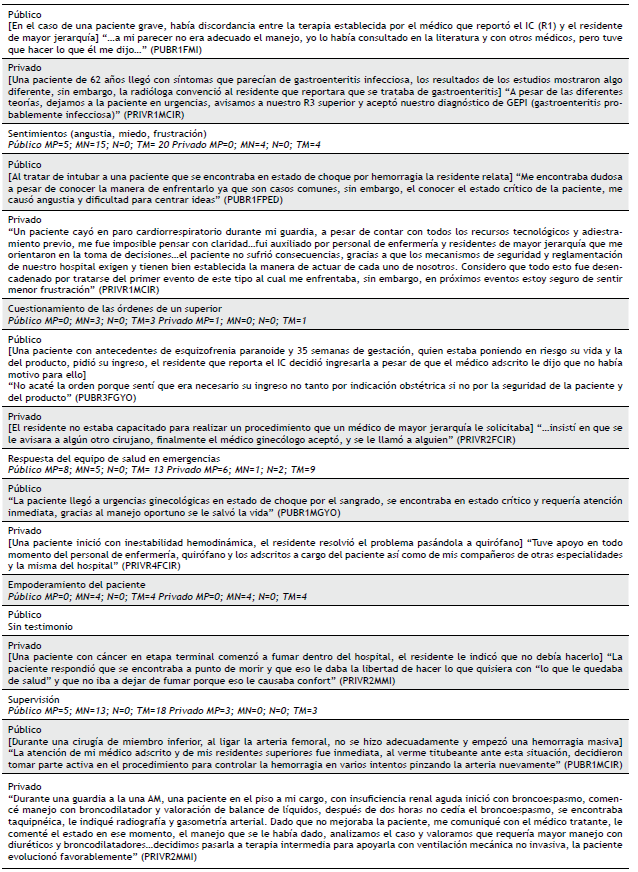 Method: Qualitative and interpretative study whose sample considered testimonies of critical incidents from 135 residents enrolled in the Plan Único de Especializaciones Médicas (PUEM) of the Faculty of Medicine at the UNAM, in the academic cycle (March 2012-February 2013), from four core specialties: Internal Medicine, Surgery, Pediatrics and Gyneco-Obstetrics at a private hospital (36.3%) and a public one (63.7%) in Mexico City.