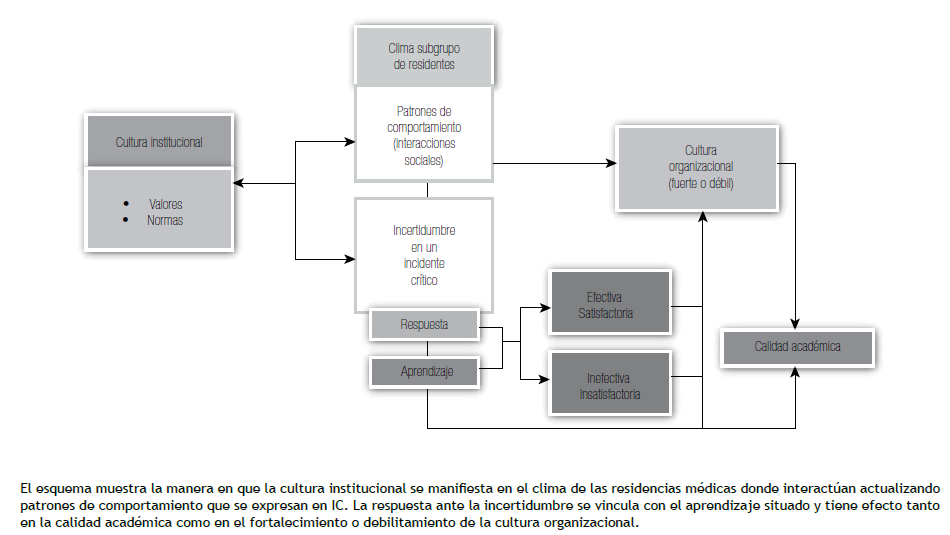 Discussion: The construction of a shared vision acted as support for the culture of the group, the values and standards allowed the response to uncertainty in a CI to be more effective, also strengthened institutional culture and favored learning. Some of the differences in the organizational culture among the public hospital and the private were the availability of material resources, coordination between the specialty services, and autonomy in decision-making, which had different effects on residents learning opportunities.