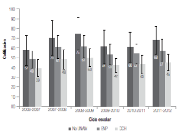 La Figura 1 presenta las medias y desviación estándar de la calificación promedio en el examen diagnóstico por ciclo escolar y tipo de bachillerato de procedencia. Se observa en cada ciclo que los estudiantes de bachillerato no asociados con la UNAM tienen las mayores calificaciones, seguidos por los de ENP y CCH. Las diferencias por pares de medias entre los tres tipos de bachilleratos, en los seis ciclos escolares, resultaron estadísticamente significativas (a un nivel de α=0.05).