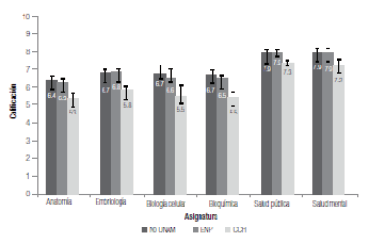 La Figura 2 muestra la calificación de las seis asignaturas de primer año, se identifican dos bloques; el primero constituido por Anatomía, Embriología, Biología Celular y Bioquímica con medias, en lo general, menores a las asignaturas del segundo bloque, formado por Salud Pública y Salud Mental. Por bachillerato de procedencia, las medias de los estudiantes que provienen del CCH, fueron menores (p<0.05) con respecto a las medias de los que provienen de la ENP y del sistema NO UNAM, entre estos dos últimos bachilleratos, no hubo diferencia estadística entre las medias de las seis asignaturas (p>0.05).