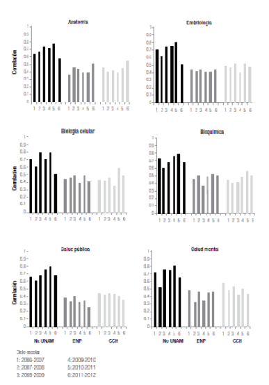 Con respecto a las asignaturas, los estudiantes de la ENP presentaron correlaciones máximas en la asignatura de Bioquímica (r=0.55), CCH en Anatomía (r=0.54) y NO UNAM en Bioquímica (r=0.82). La correlación mínima se observó para la ENP en la asignatura de Salud Pública (r=0.26) (Tabla 3). En Embriología los estudiantes de la ENP mostraron correlaciones de 0.4 de forma consistente durante los seis ciclos escolares (Figura 3).